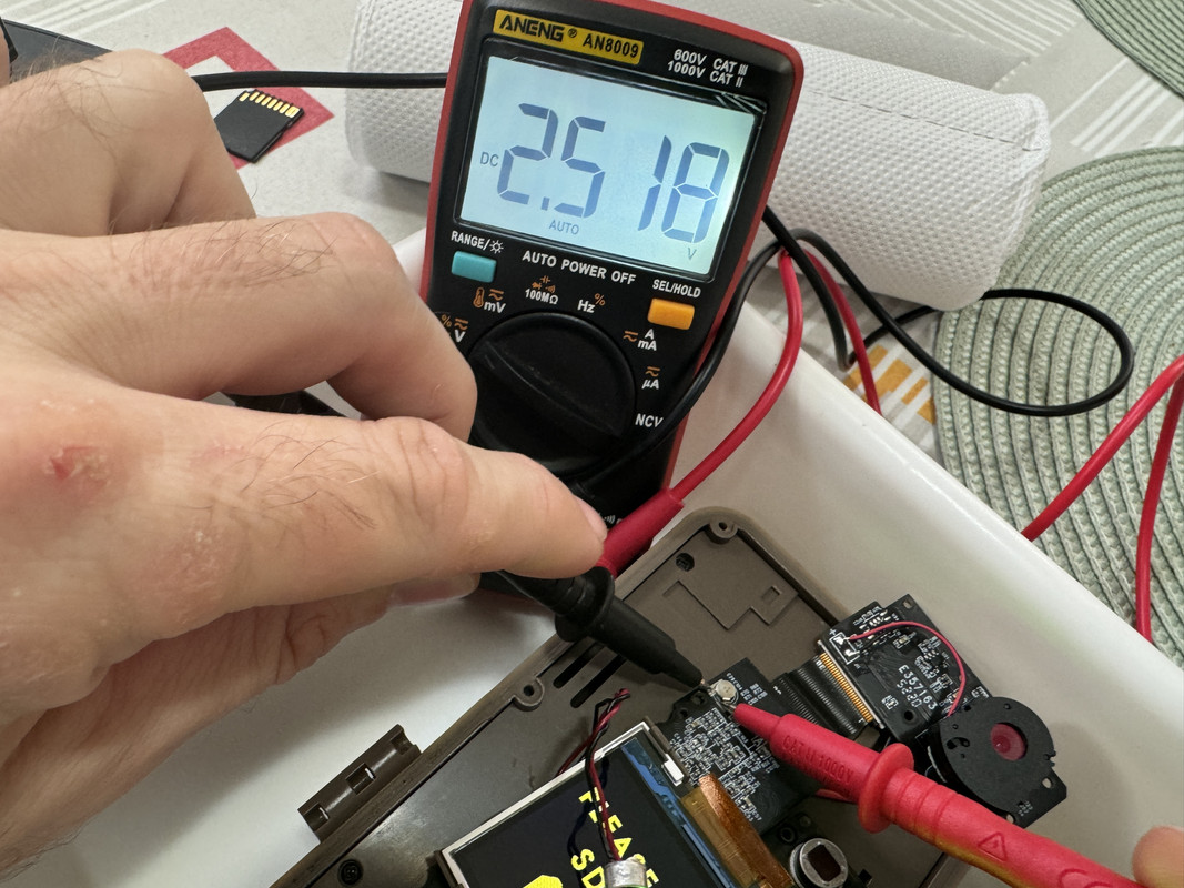 If you can measure the voltage of a AA battery with a multimeter, you can measure the voltage of this ultra capacitor 🙂 You just need to put the leads on each of the two terminals. I’ll send you a marked up photo. The trickiest part is having the camera hooked up to power with it all taken apart, and with access to the backside of the PCB.